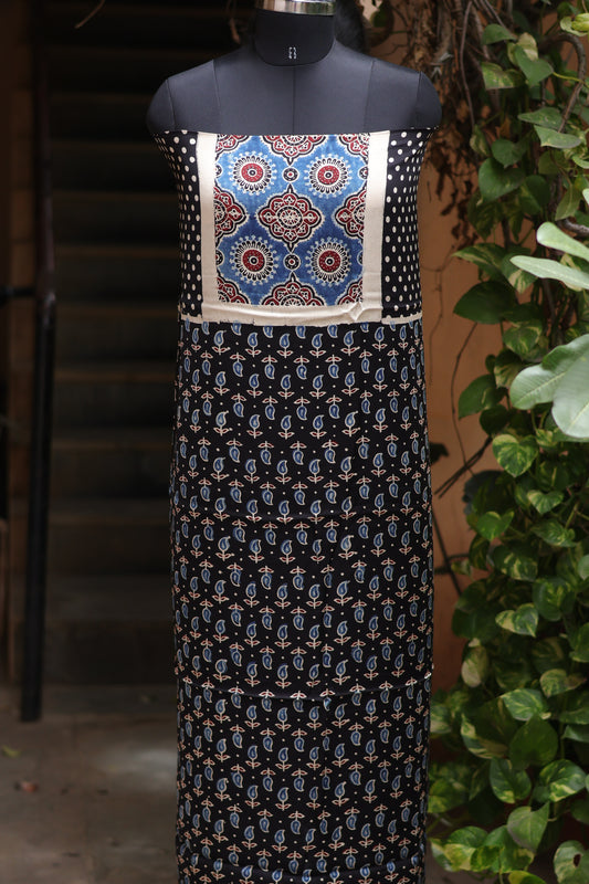 Black Handblock printed Ajrakh dola silk 2 piece suit (stitch