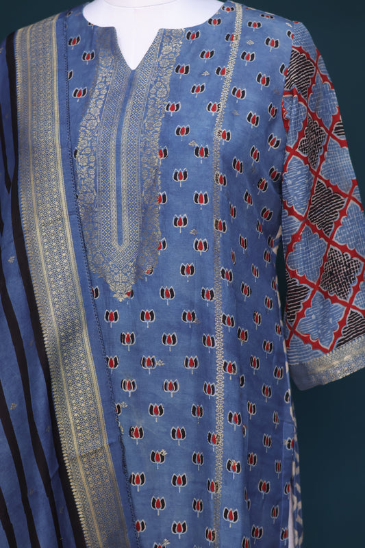 Indigo Handblock printed Ajrakh dola silk 2 piece suit (stitched)