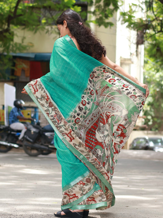Sea Green Checks Kalamkari dyeing premium chennur silk saree