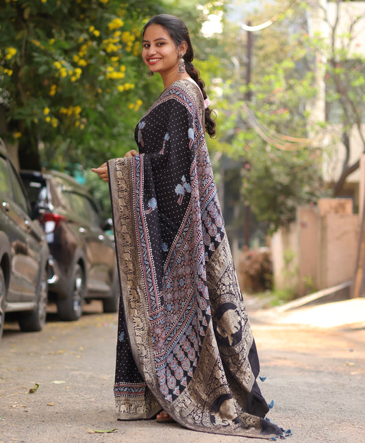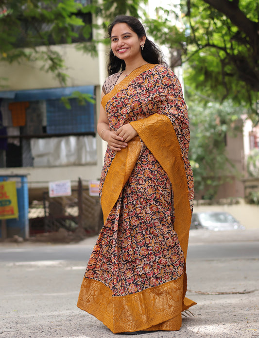 Black & Mustard Kuppadam Border Kalamkari Uppada Silk Saree