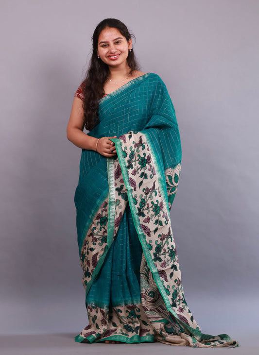 Peacock Green Plain Gap Border Kalamkari Premium Chennur Silk Handcrafted Saree