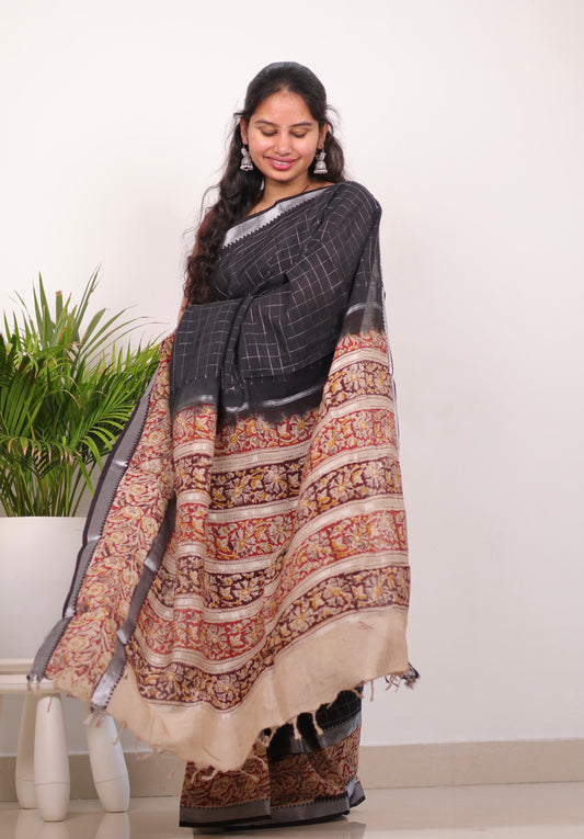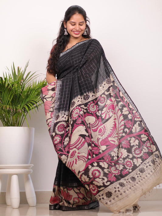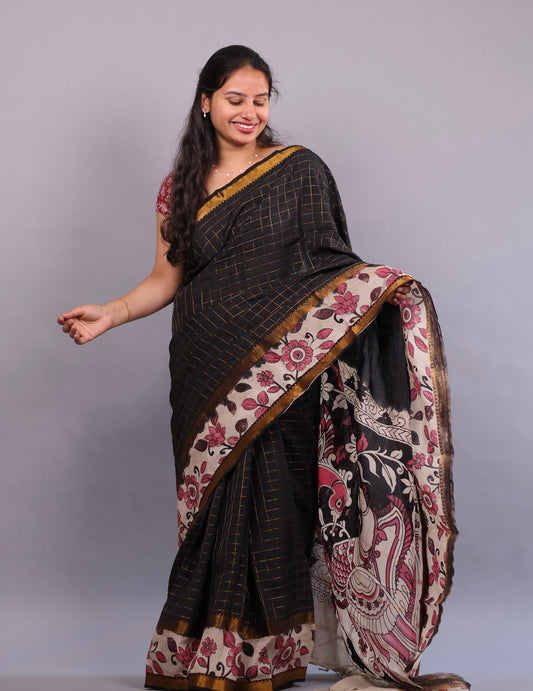 Black Checks Kalamkari dyeing premium chennur silk saree