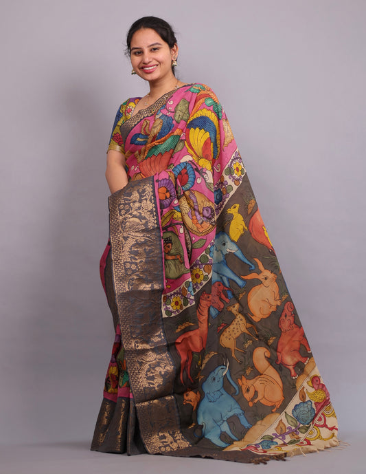 Pink Plain Gap Border Kalamkari Premium Chennur Silk Handcrafted Saree