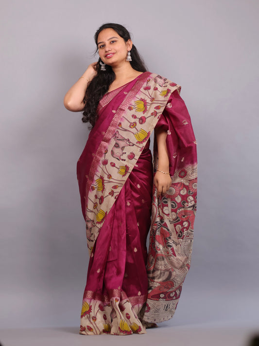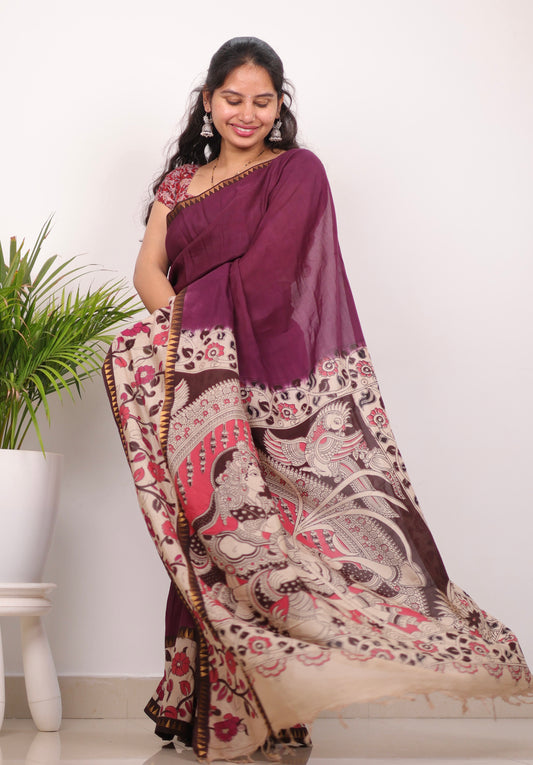 Wine Plain Gap Border Kalamkari Premium Chennur Silk Handcrafted Saree