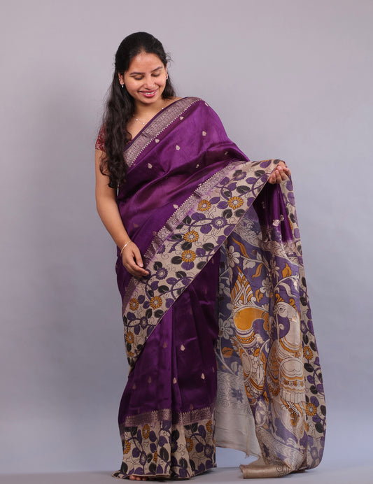 Violet Kalamkari Dyeing Premium Chennur Silk With Handblock Printed Saree