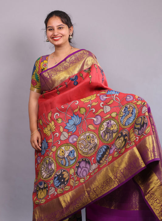 Kanchi Pattu Hand Painted Pen Kalamkari Saree