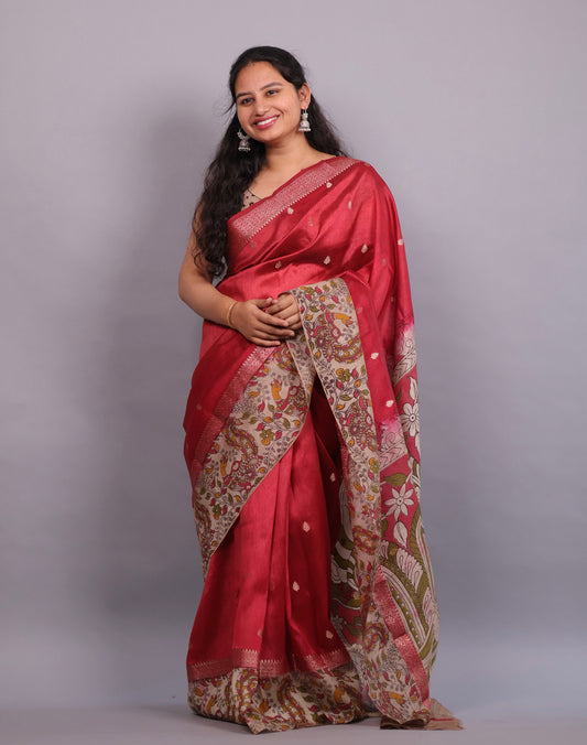 Red Hand Drawn Pure Kanchi Pattu Pen Kalamkari Saree | Looms & Tassels