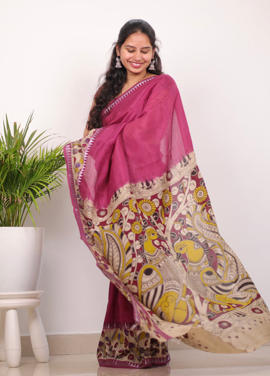 Magenta Plain Gap Border Kalamkari Premium Chennur Silk Handcrafted Saree