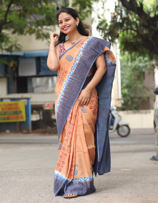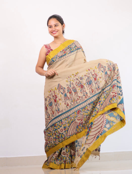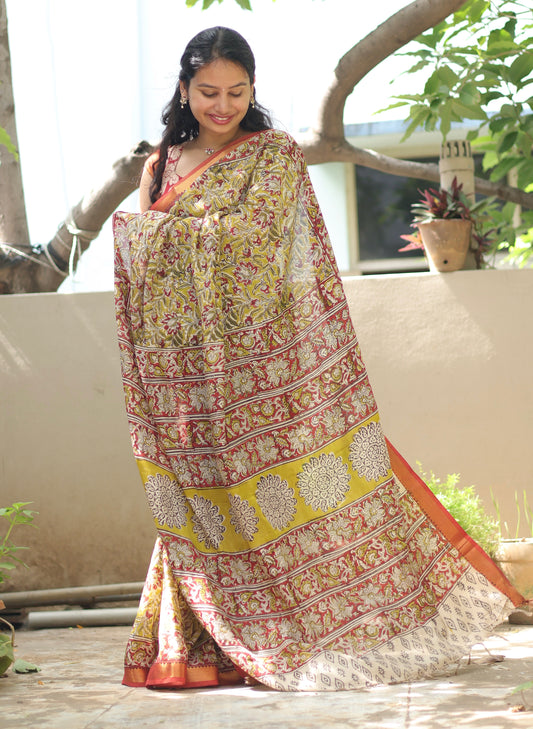 Mustard Hand Block Printed Kalamkari Nizam Border Silk Sare
