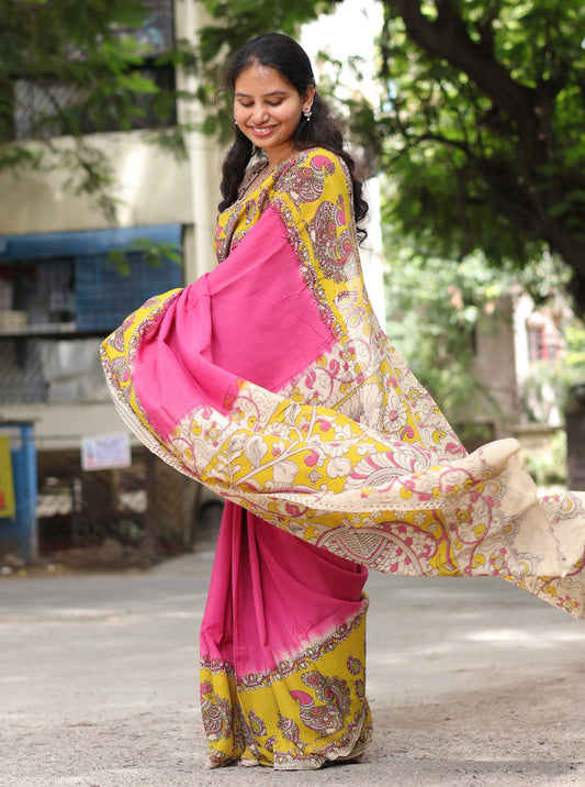 Pink & Yellow Kalamkari dyeing premium chennur silk saree