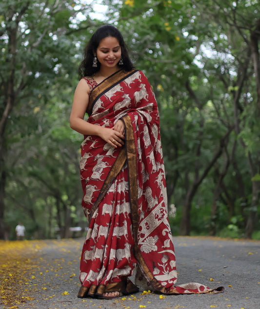 Red Hand Block Printed Kalamkari Nizam Border Silk Sare
