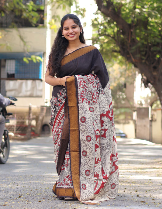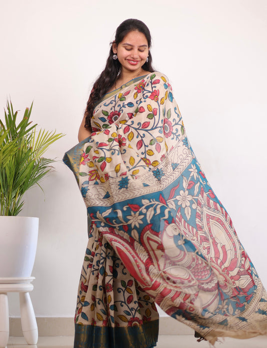 Cream Outline Kalamkari Handcrafted Kanchi Border Saree