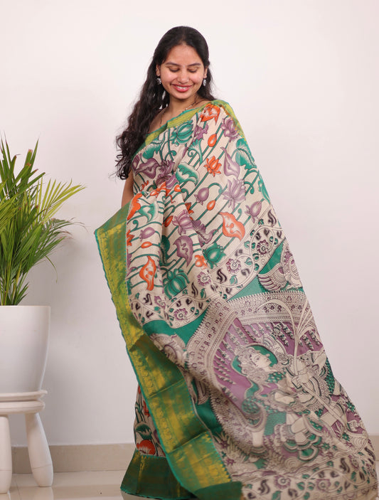 Cream & Green Kanchi border Kalamkari chennur silk saree