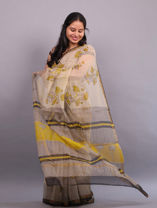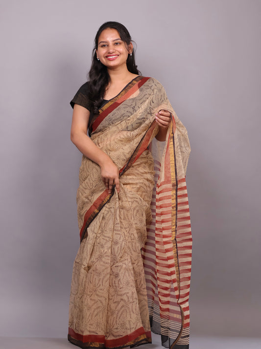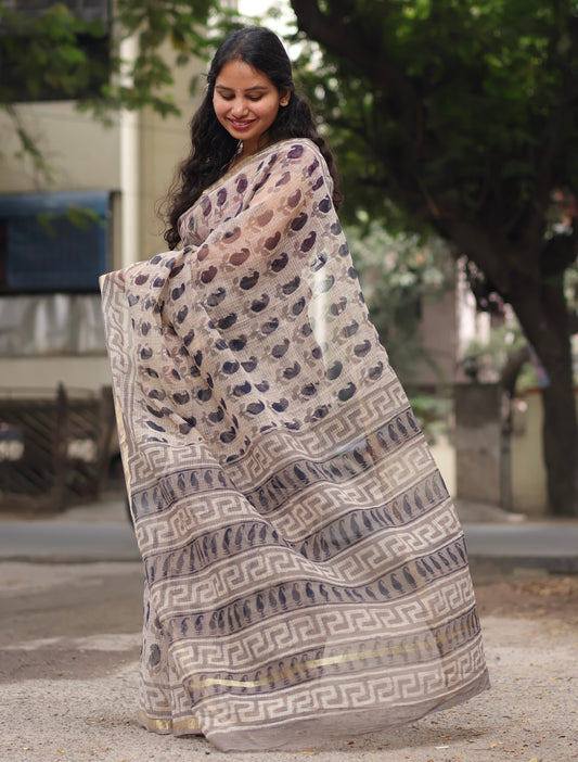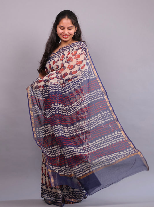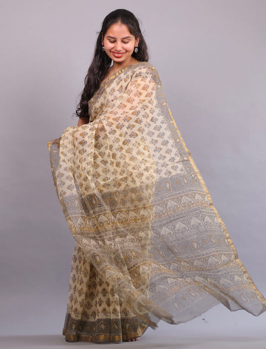 Cream Bagru Hand block printed Kota Doriya Saree