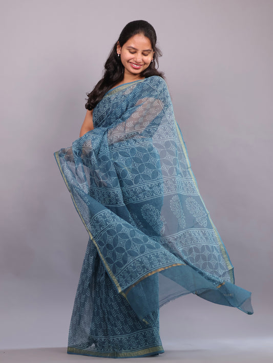 Blue Bagru Hand block printed Kota Doriya Saree