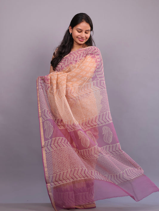 Peach Mandhara Bagru printed Kota Doriya Saree