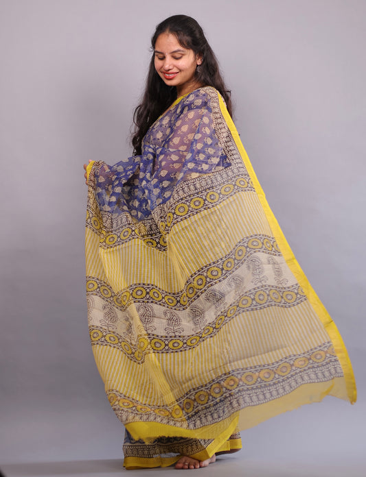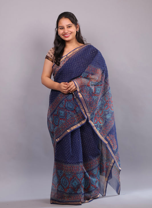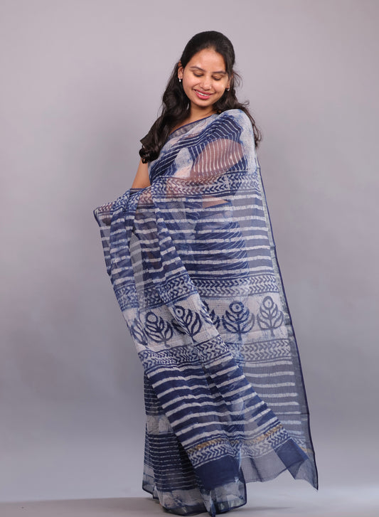 Indigo Bagru Hand block printed Kota Doriya Saree