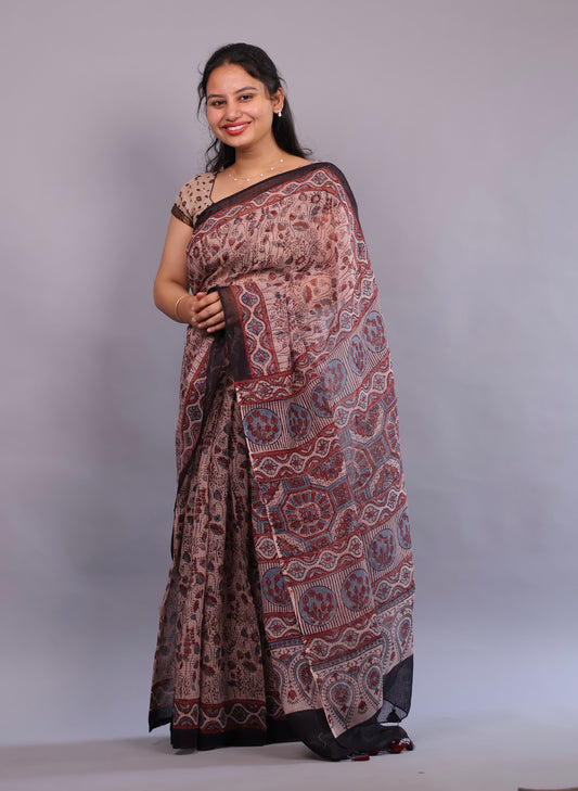 Cream Ajrakh Hand Block Printed Kota Doria Saree | Looms & Tassels