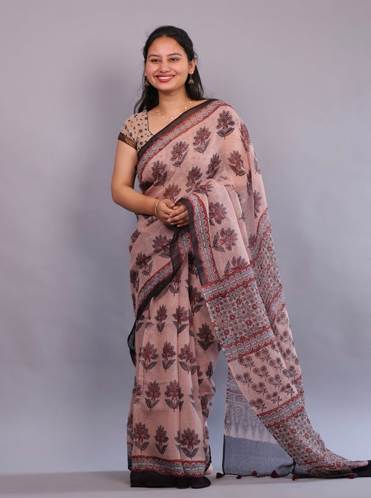 Pure Kota Doria Saree with Bagru Handblock Prints – Pink | Looms&Tassels