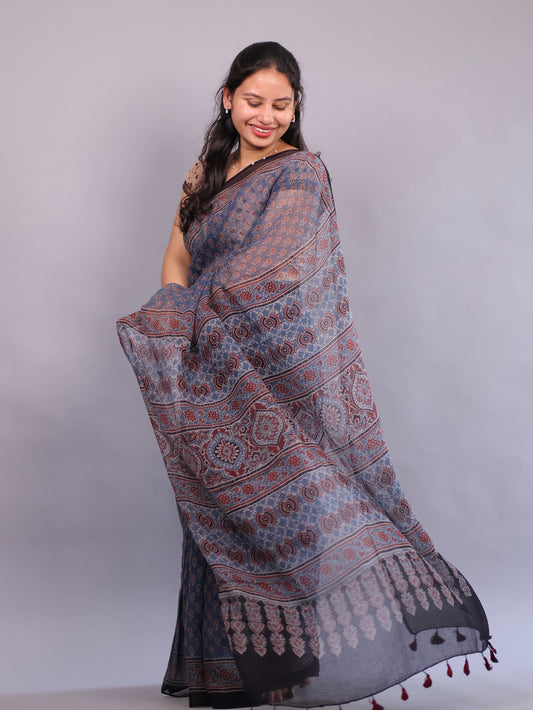 Ajrakh Hand Block Printed Kota Doria Saree | Looms & Tassels