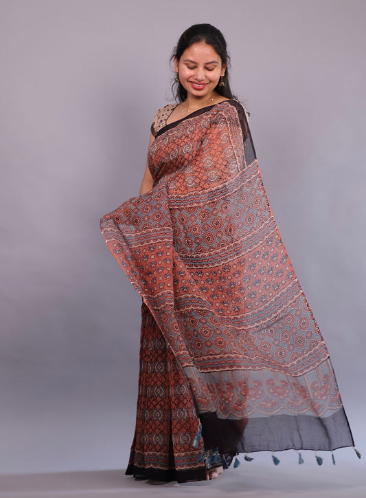 Rust Orange Ajrakh Hand Block Printed Kota Doria Saree | Looms & Tassels