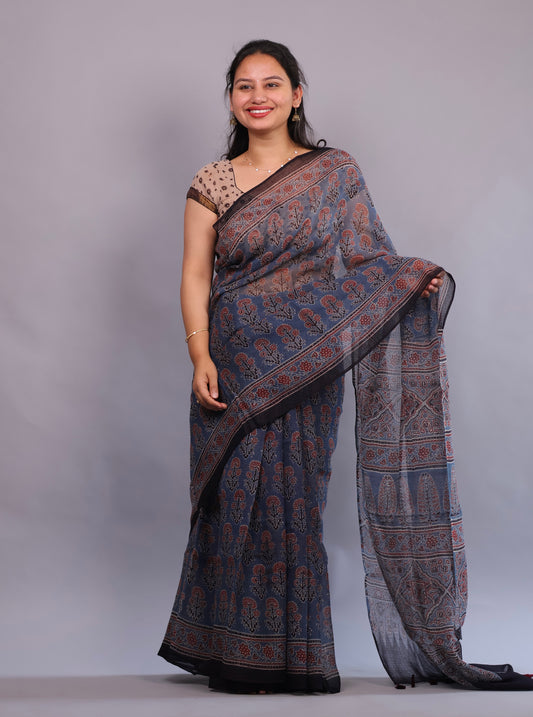 Indigo Ajrakh Hand Block Printed Kota Doria Saree | Looms & Tassels