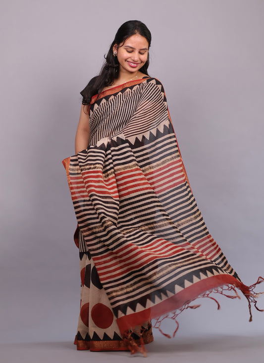 Stripes Bagru Hand Block Printed Maheswari Silk Cotton Saree