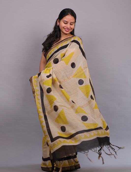 Mustard & Cream Bagru Hand Block Printed Maheswari Silk Cotton Saree