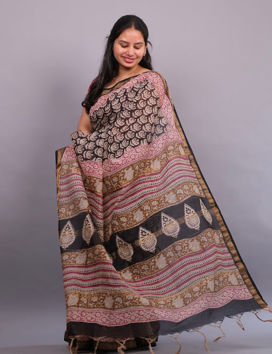 Black Bagru Hand Block Printed Maheswari Silk Cotton Saree