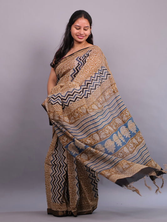 Bagru Hand Block Printed Maheswari Silk Cotton Saree