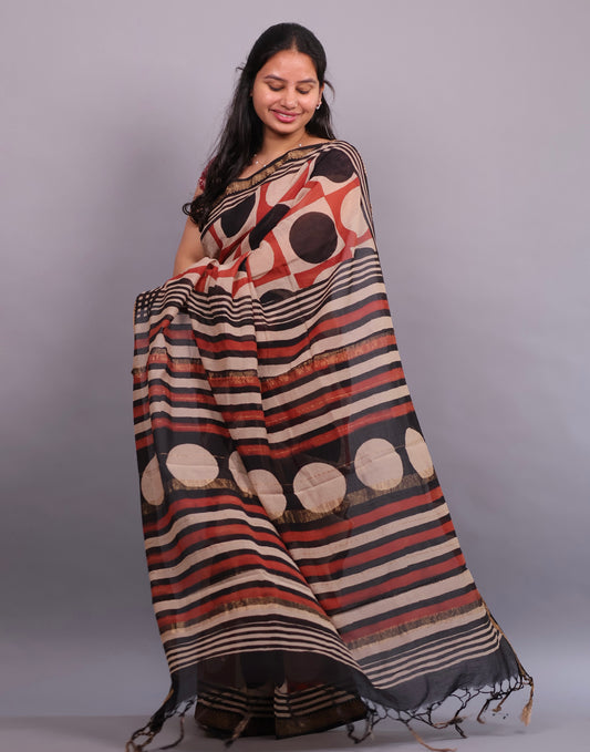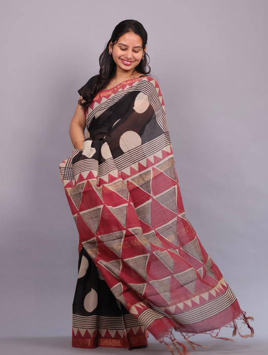 Red & Black Bagru Hand Block Printed Maheswari Silk Cotton Saree