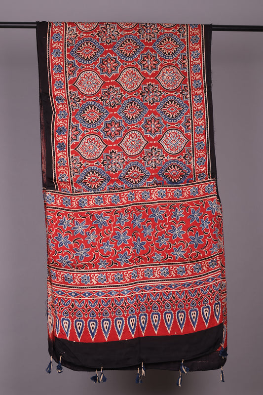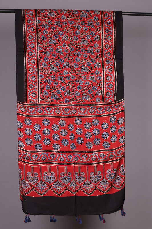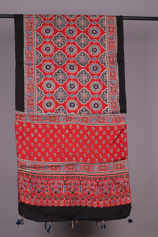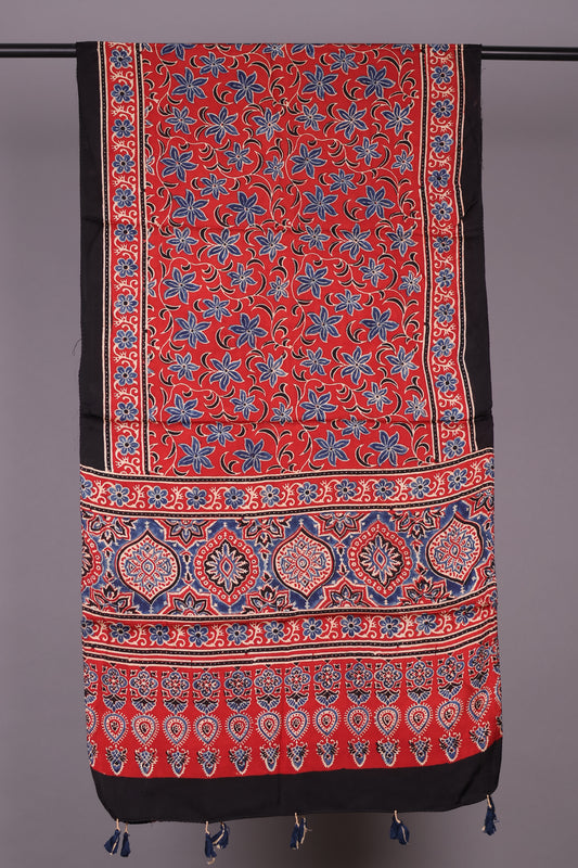 Red Ajrakh Hand Block Printed Modal Silk Stole | Looms & Tassels