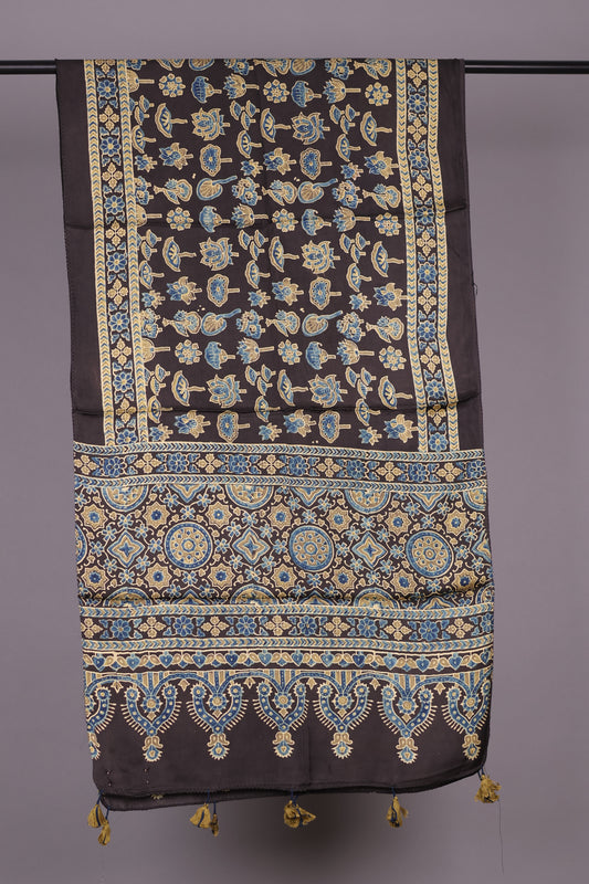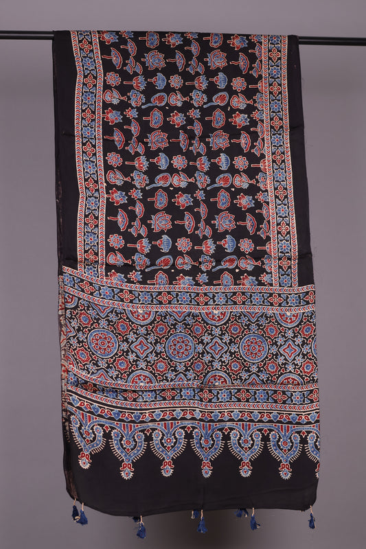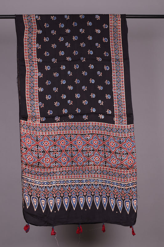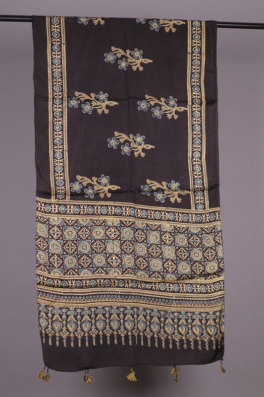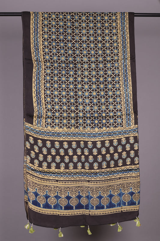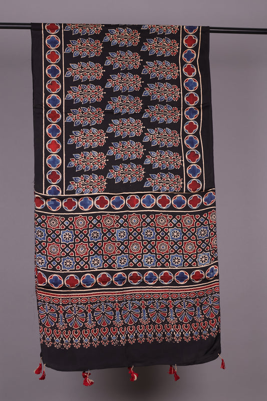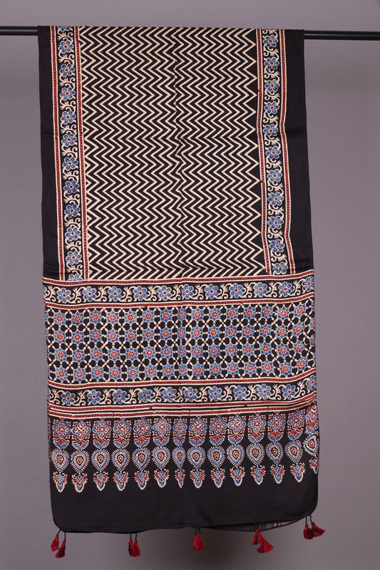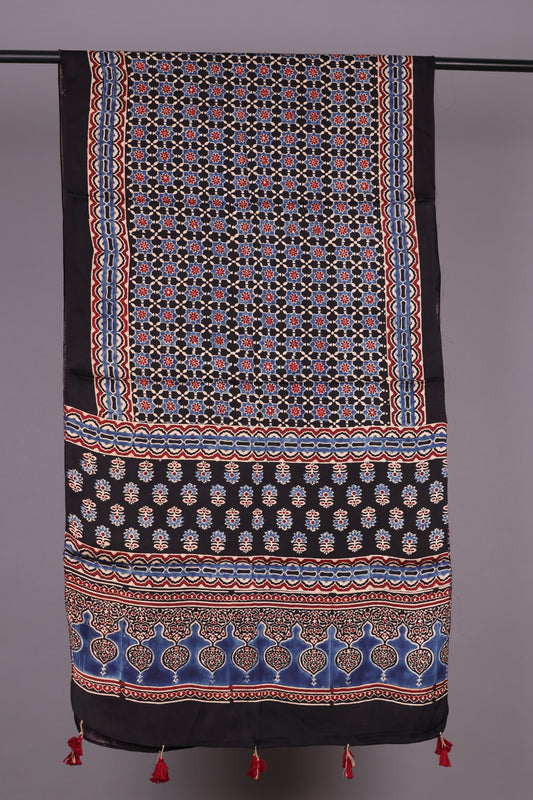 Black Ajrakh Hand Block Printed Modal Silk Stole | Looms & Tassels