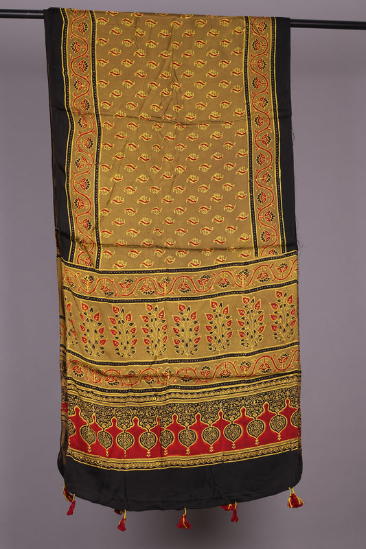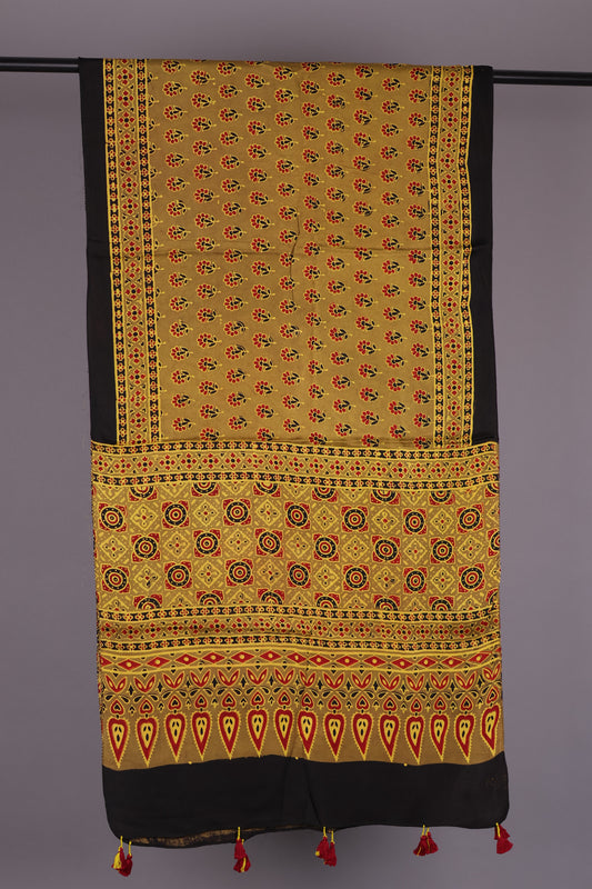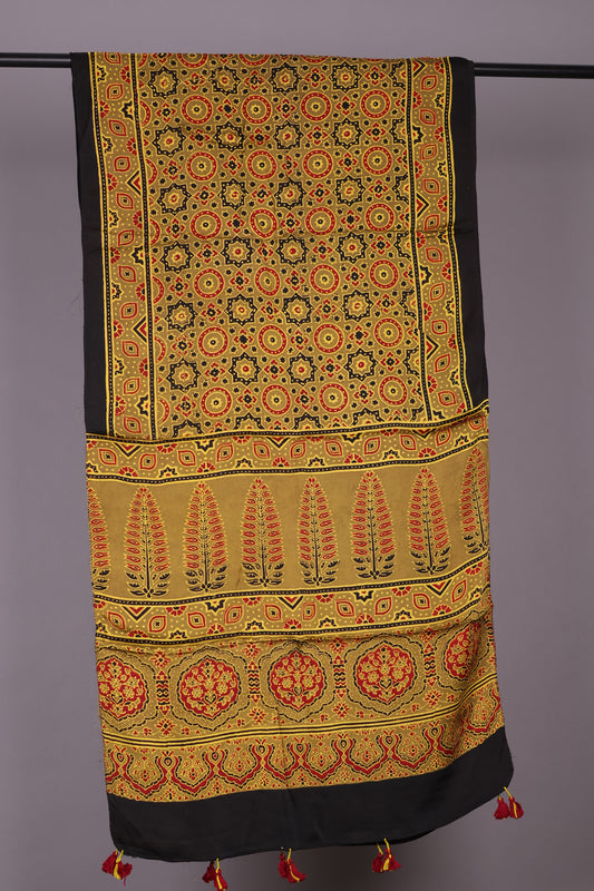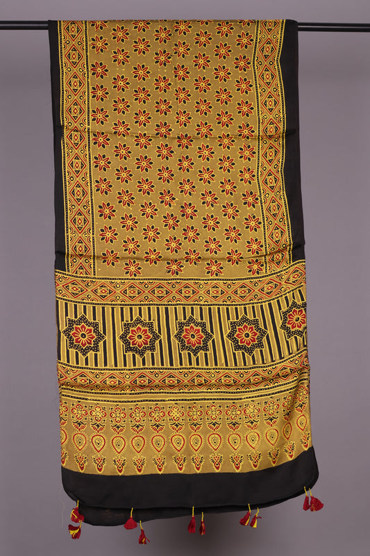 Mustard Ajrakh Hand Block Printed Modal Silk Stole | Looms & Tassels