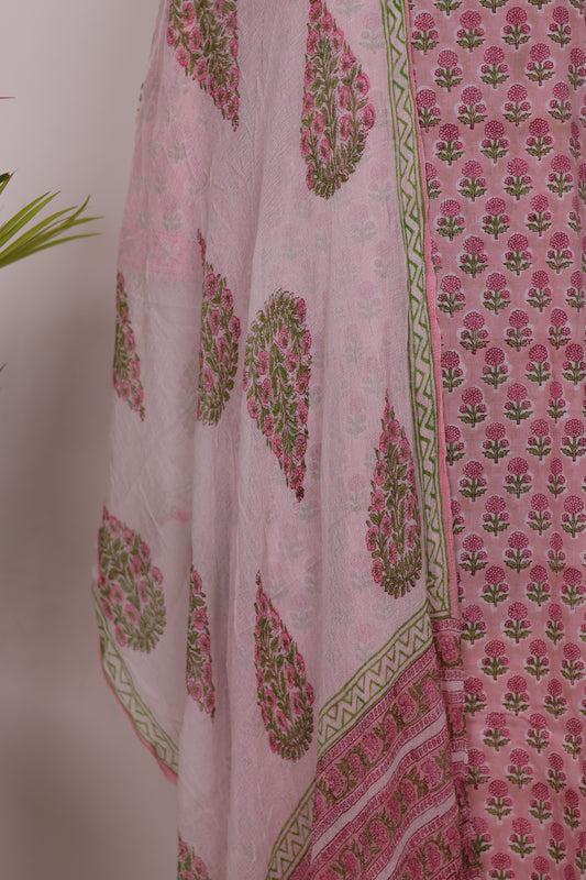 Pink Handblock printed Pure Mul Cotton with Mul Cotton Duppata 3 piece suit (stitched)
