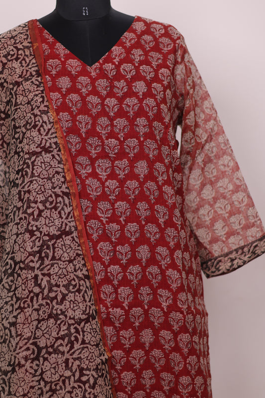 Red & Black Handblock printed kota 3 piece suit (stitched)