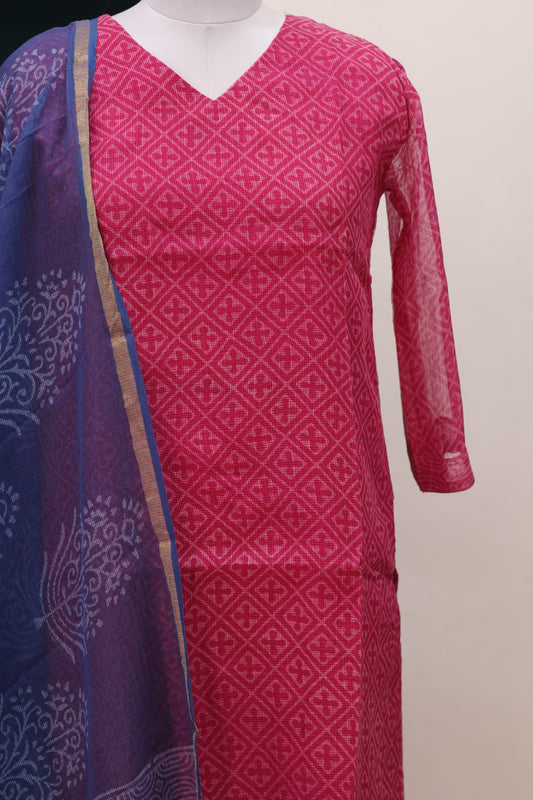 Pink Handblock printed Pure Mul Cotton with Chiffon Duppata 3 piece suit (stitched)