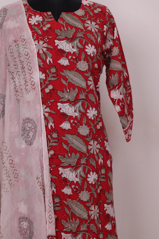 Red Handblock printed Pure Mul Cotton with Chiffon Duppata 3 piece suit (stitched)