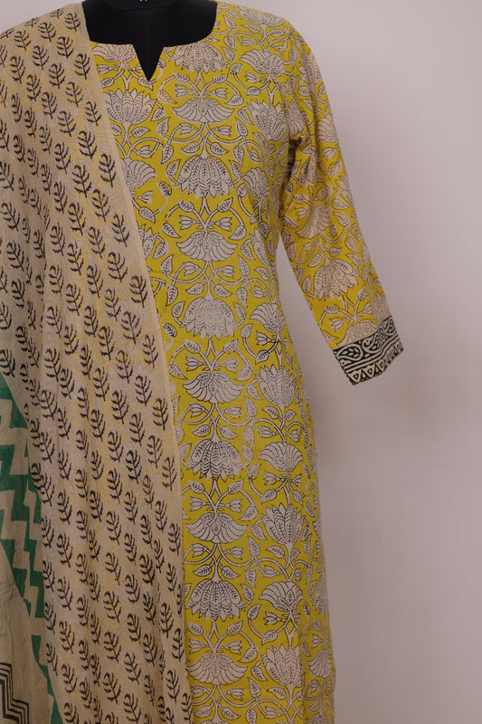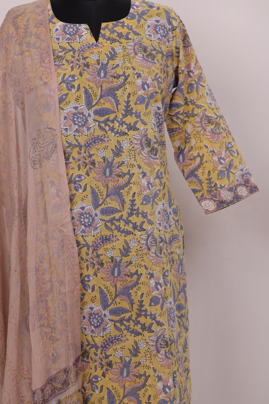 Yellow Handblock printed Pure Mul Cotton with Chiffon Duppata 3 piece suit (stitched)