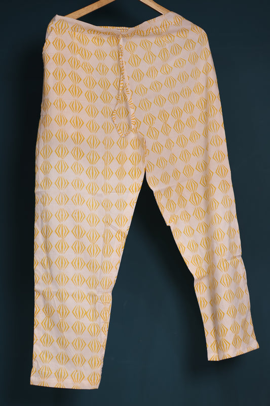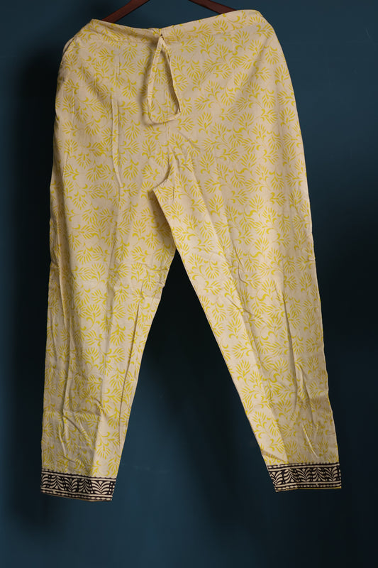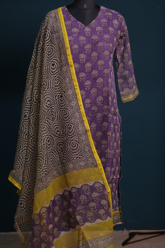 Yellow Handblock printed kota 3 piece suit (stitched)