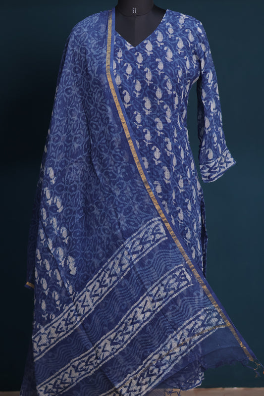 Blue Handblock printed Pure Mul Cotton with Kota Doria Duppata 3 piece suit (stitched)