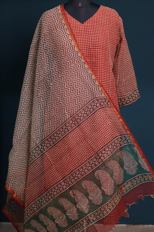 Red & Black Handblock printed kota 3 piece suit (stitched)