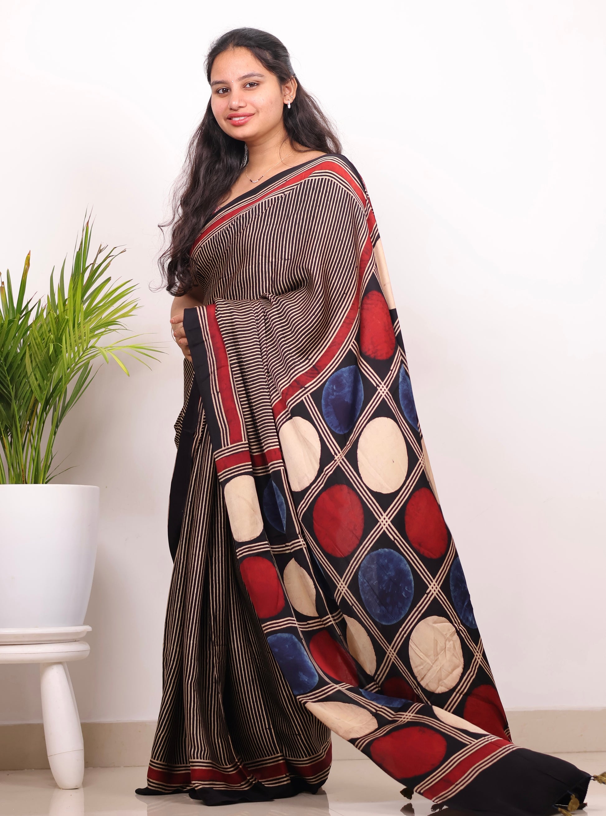 Our Black Stripes Contemporary Ajrakh Modal Silk Saree is handcrafted by skilled artisans from Ajrakhpur, Kutch, Gujarat. Made using premium modal silk and traditional Ajrakh handblock techniques, this saree features elegant Black Stripes Contemporary created with natural dyes.