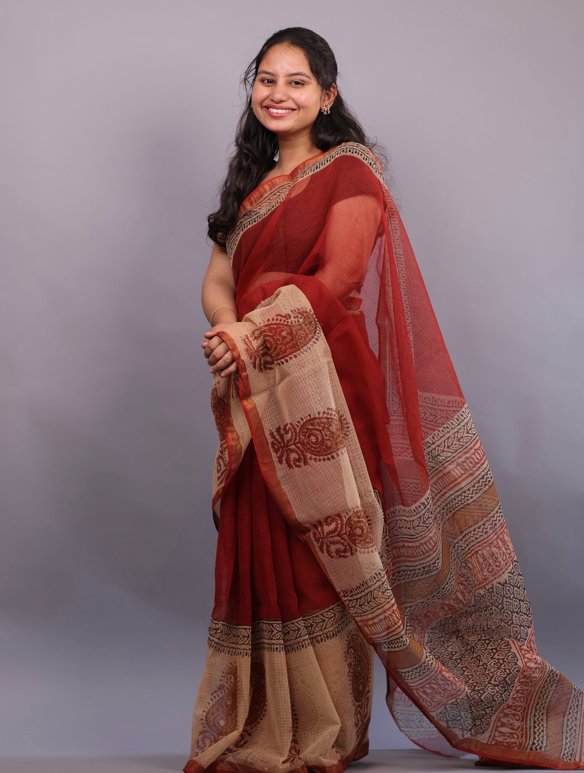 Pure Kota Doria Saree with Bagru Handblock Prints – Rust Maroon | Looms&Tassels