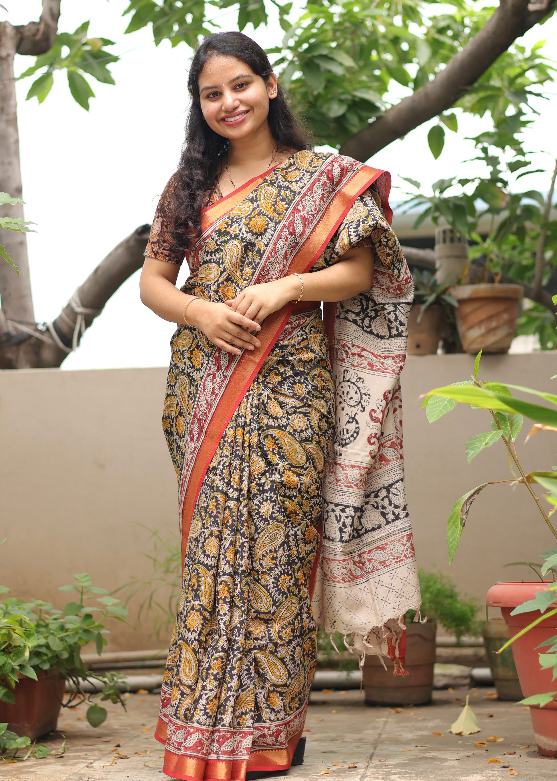 Black Hand Block Printed Kalamkari Nizam Border Silk Sare