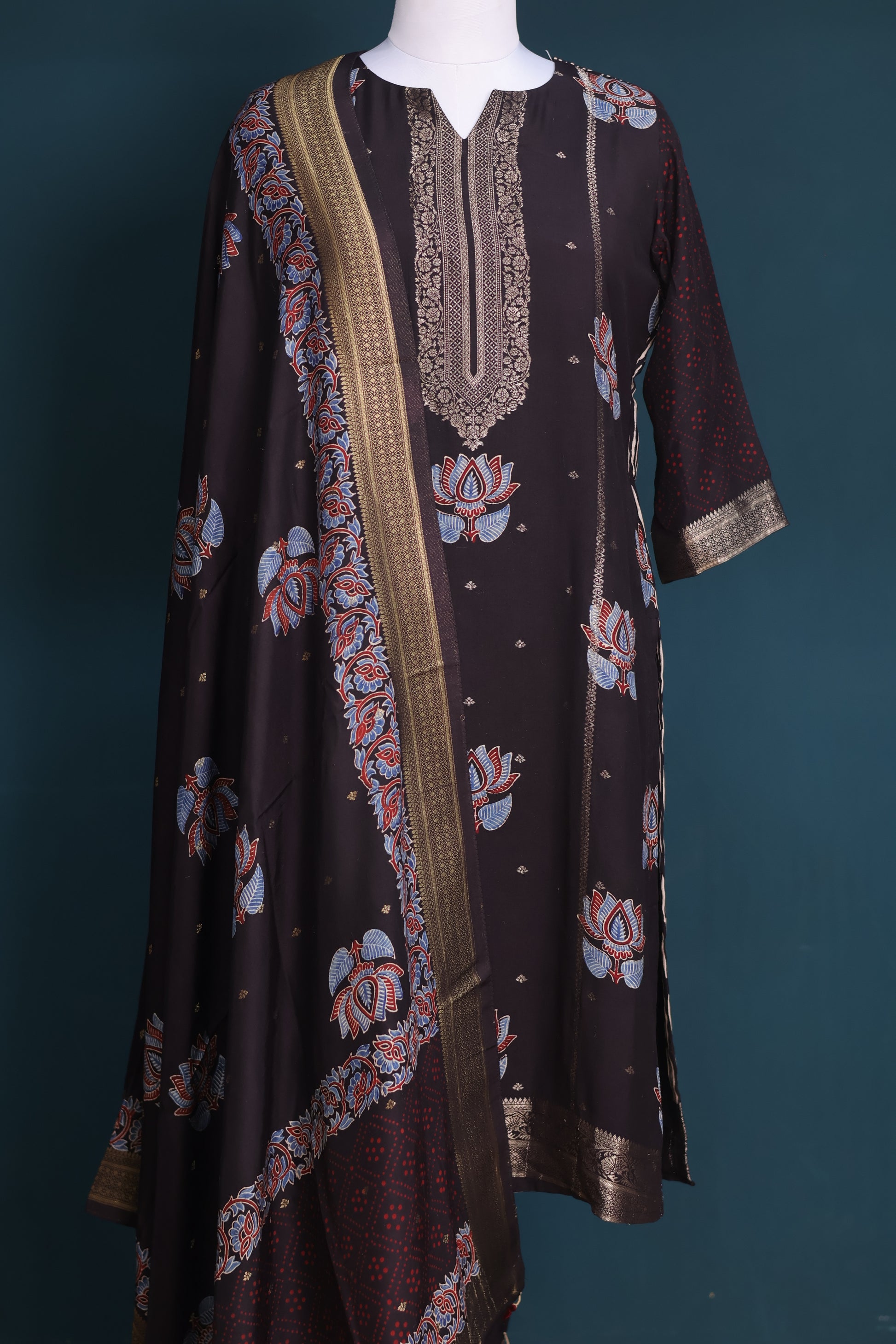 Handblock ajrakh dola silk top with ajrakh dOla silk duppata accessorized with tassels. ( 2 piece suit set stitched )