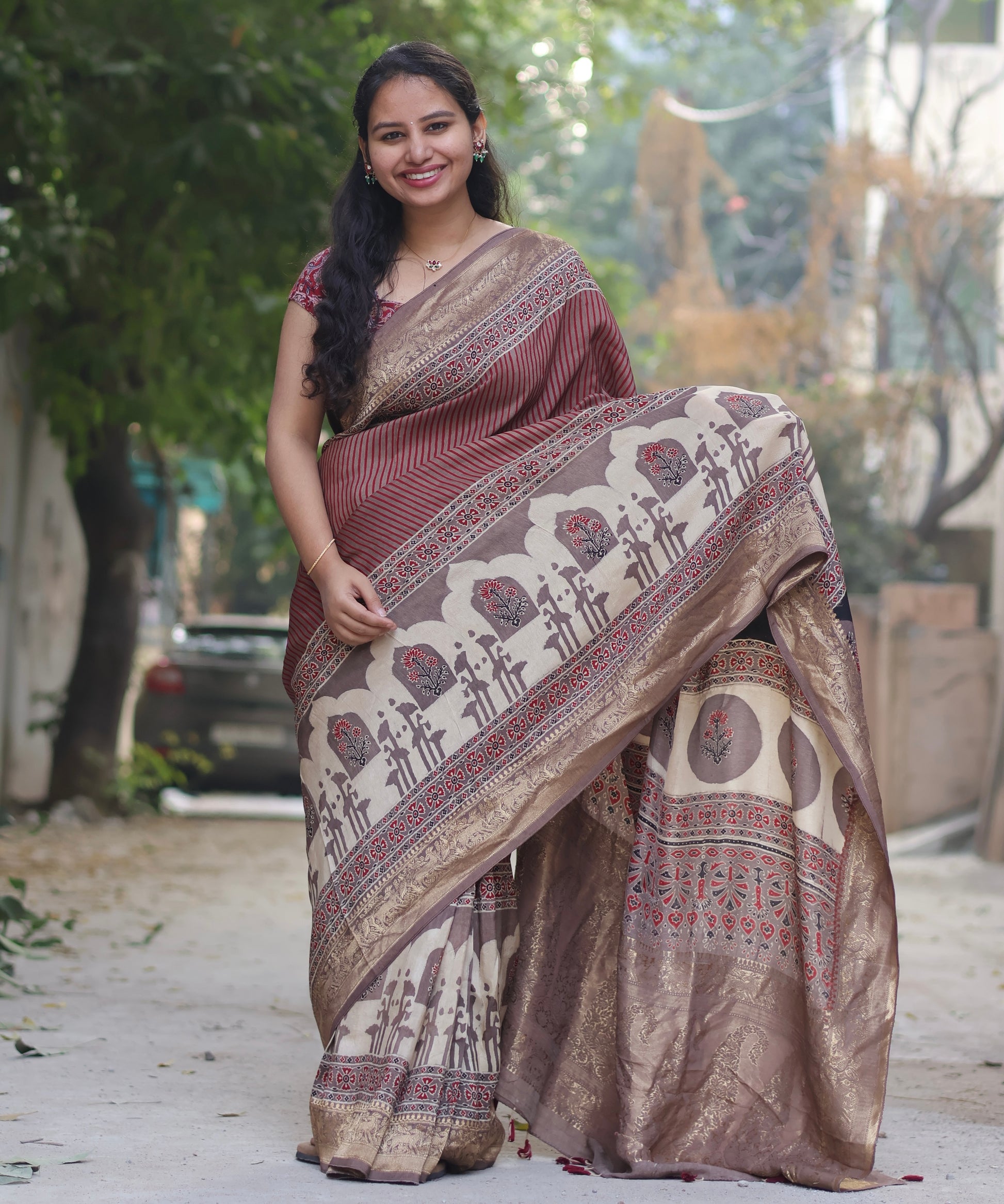 Contemporary Ajrakh Handblock Printed Dola Silk Saree