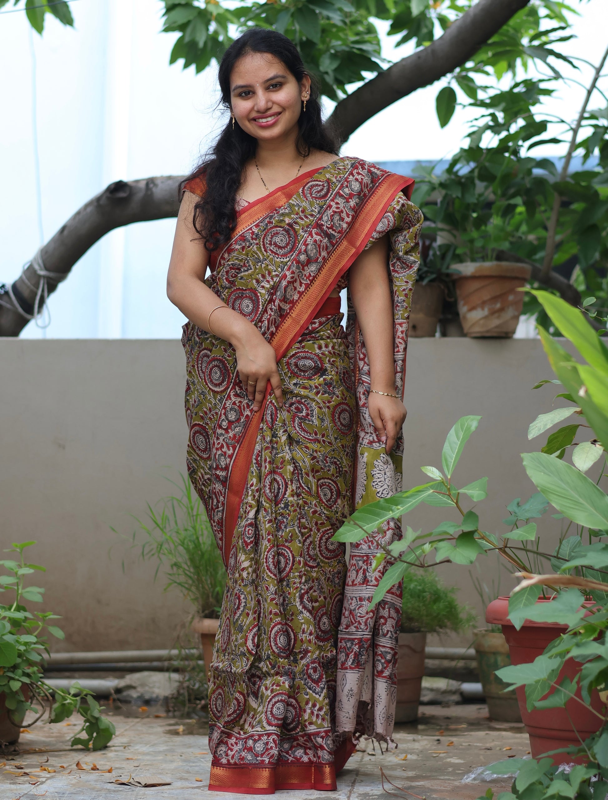 Hand Block Printed Kalamkari Nizam Border Silk Saree