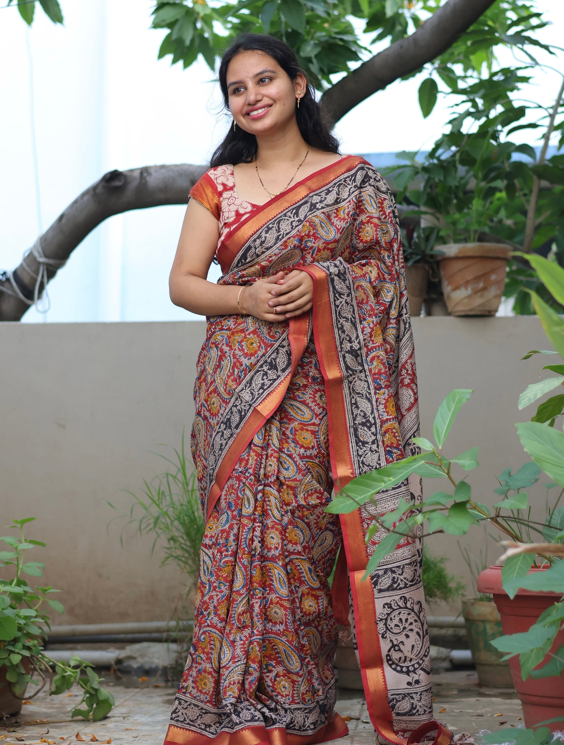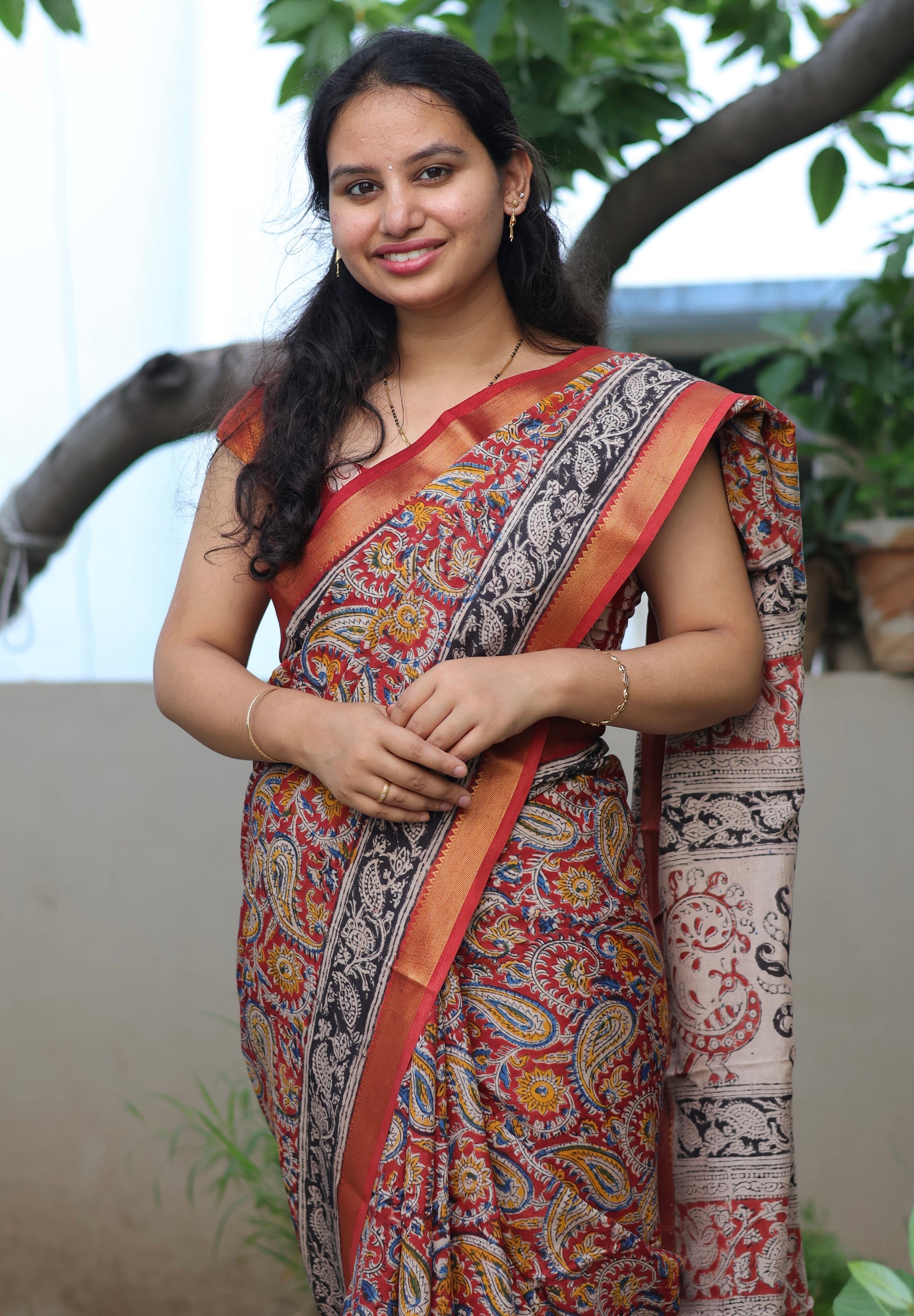 Hand Block Printed Kalamkari Nizam Border Silk Saree
