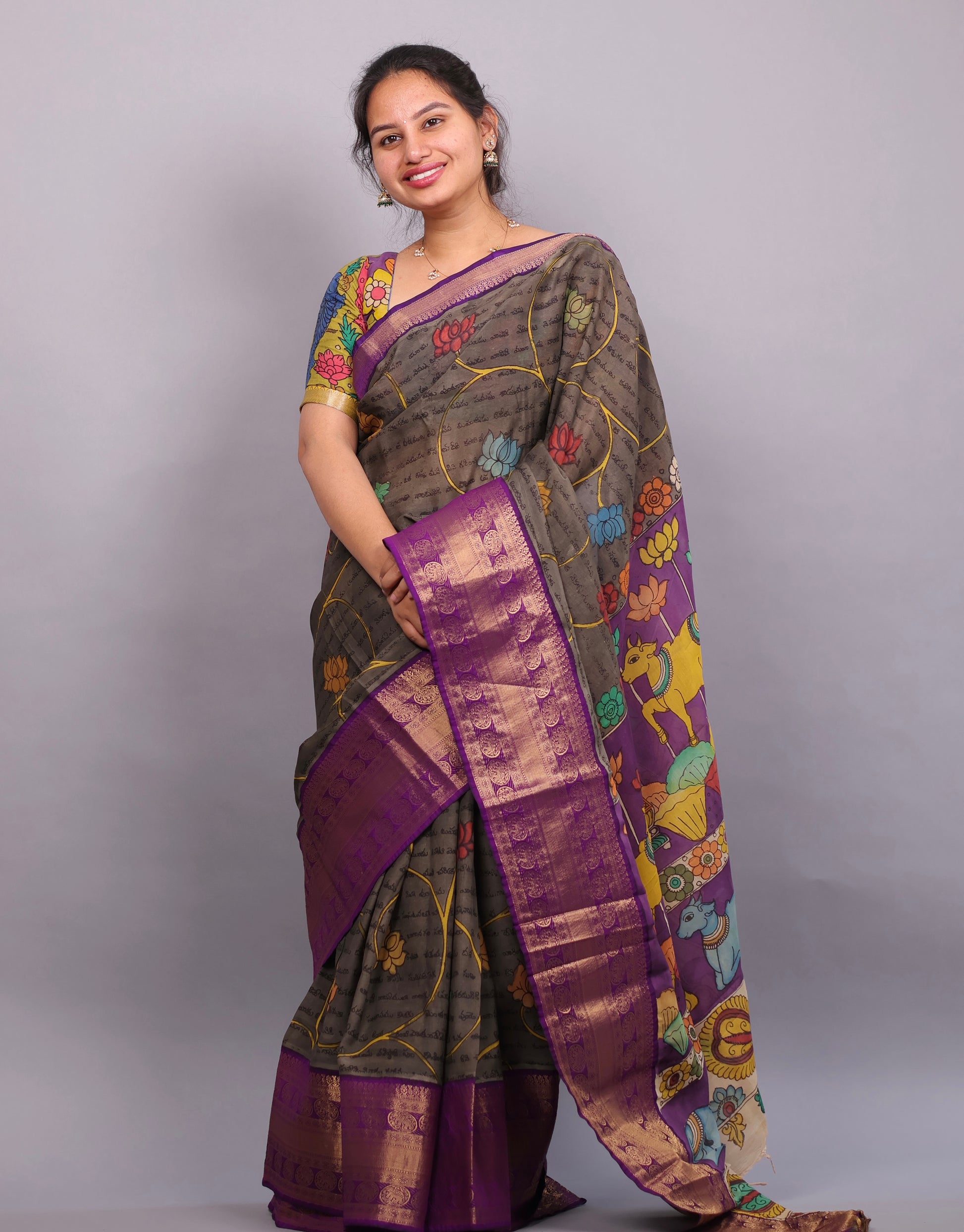 Grey Hand Painted Pen Kalamkari Silk Saree
